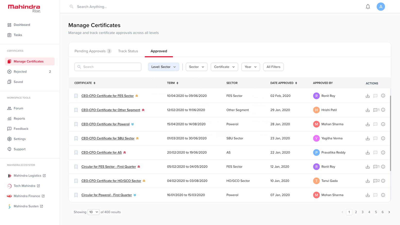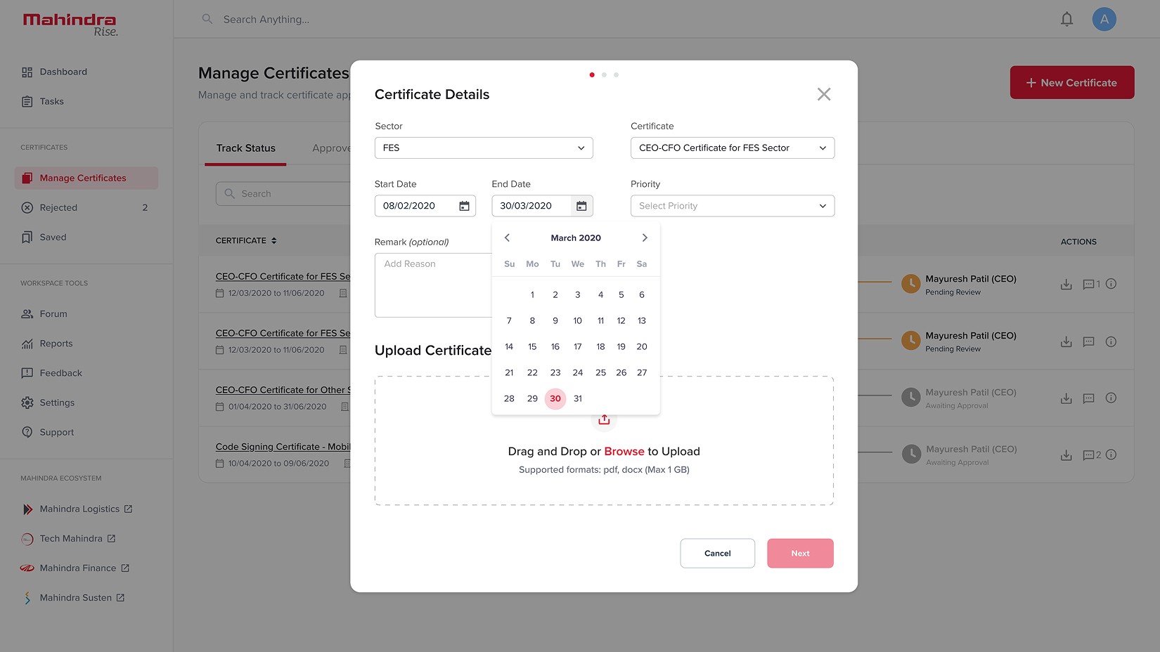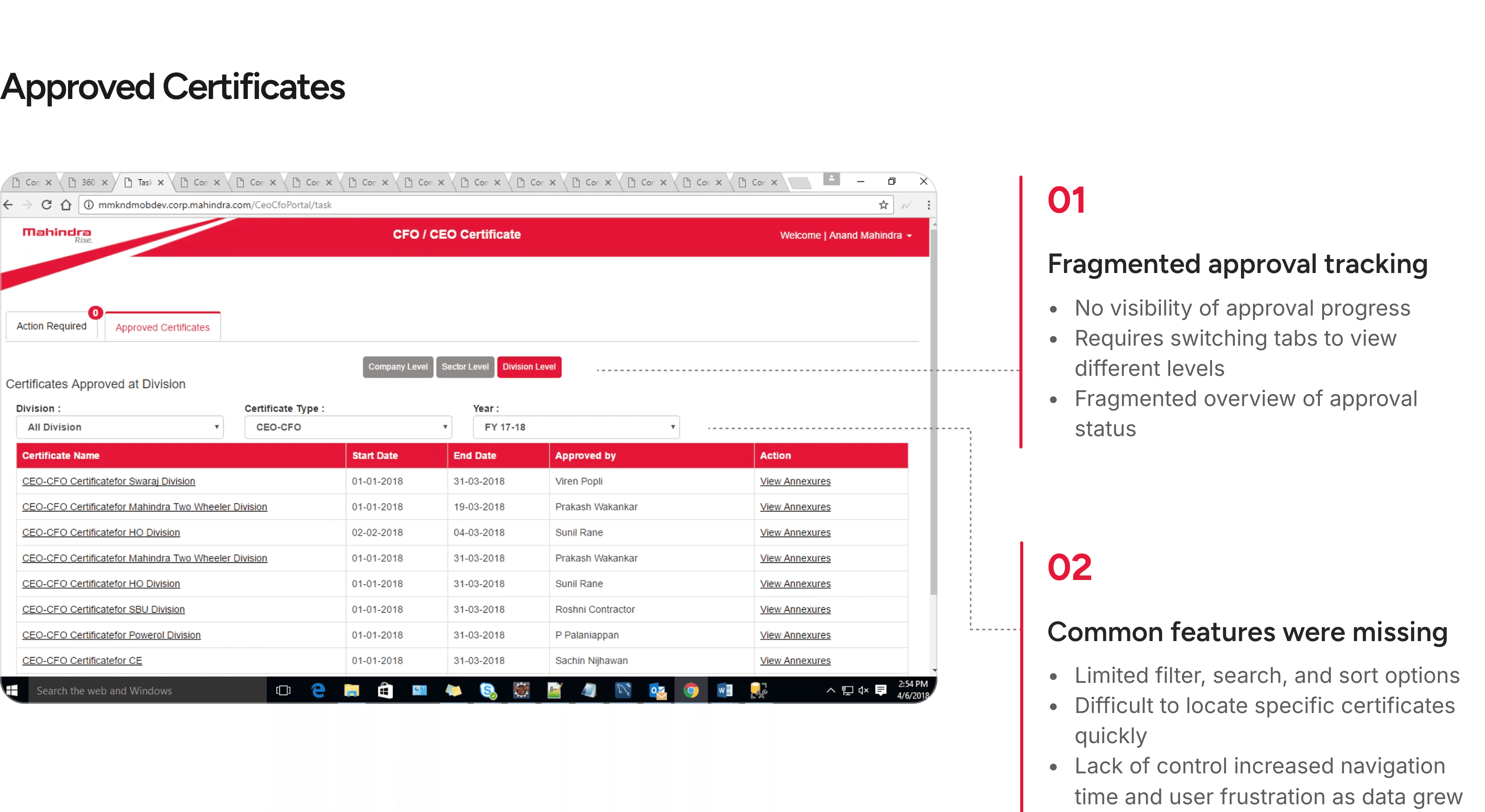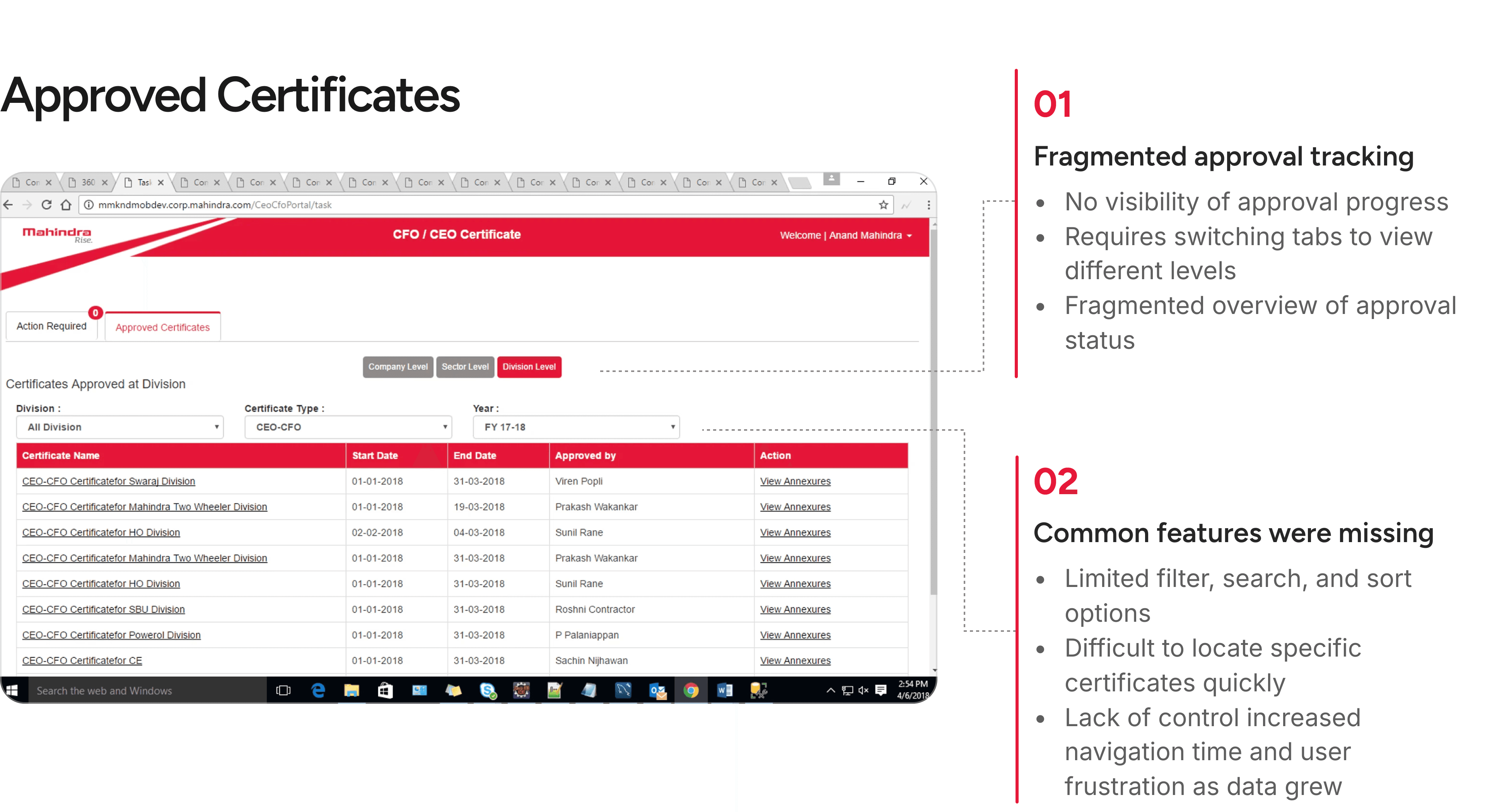 During the early days of COVID-19, as remote work became the norm, Mahindra Rise - an Indian multinational conglomerate approached our agency to redesign their internal CEO-CFO Portal, essential for managing certificate approvals across Divisions, Sectors, and Companies. Collaborating remotely with fellow designers and Mahindra teams, I simplified and redesigned a complex, multi-tiered workflow used across the organization.