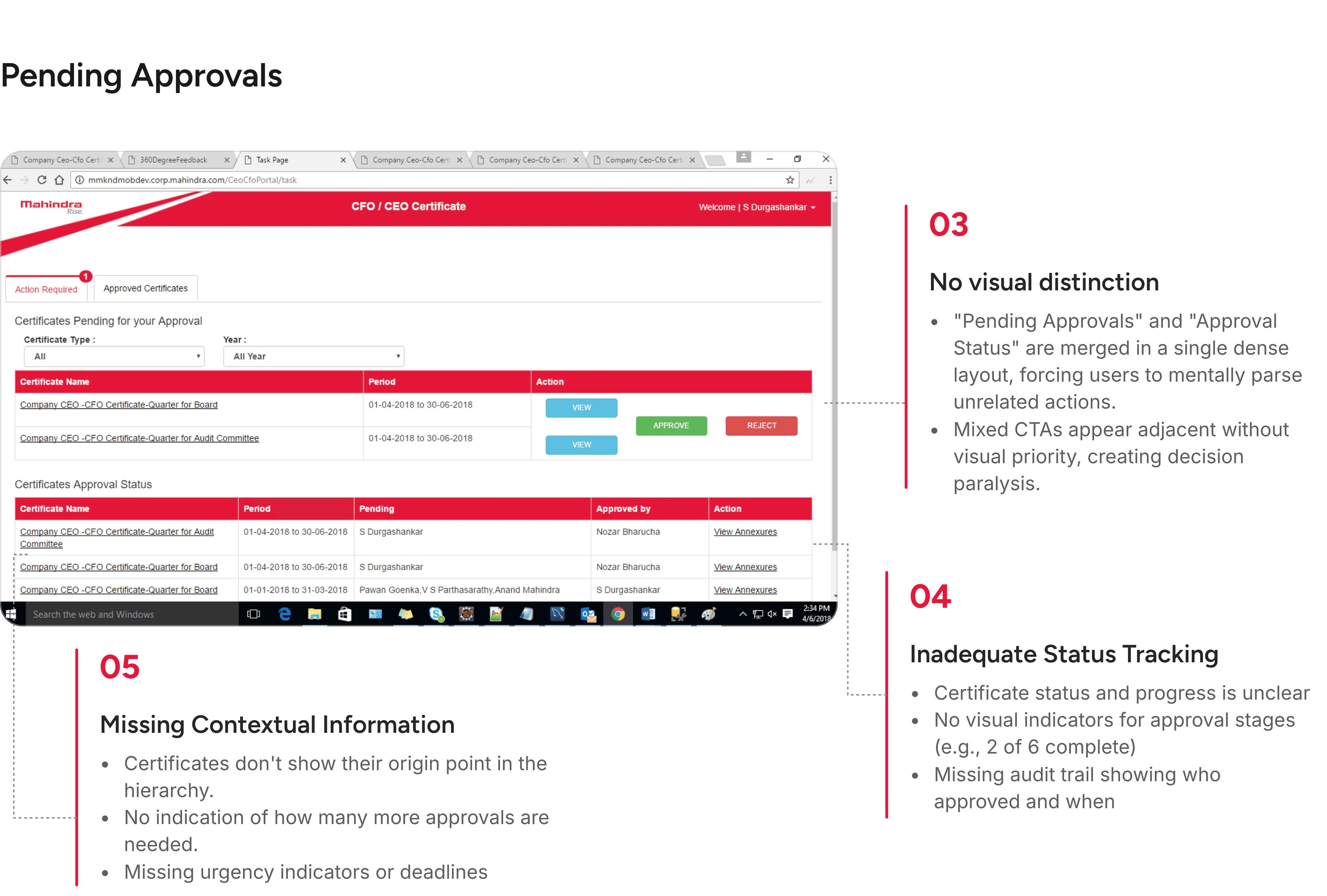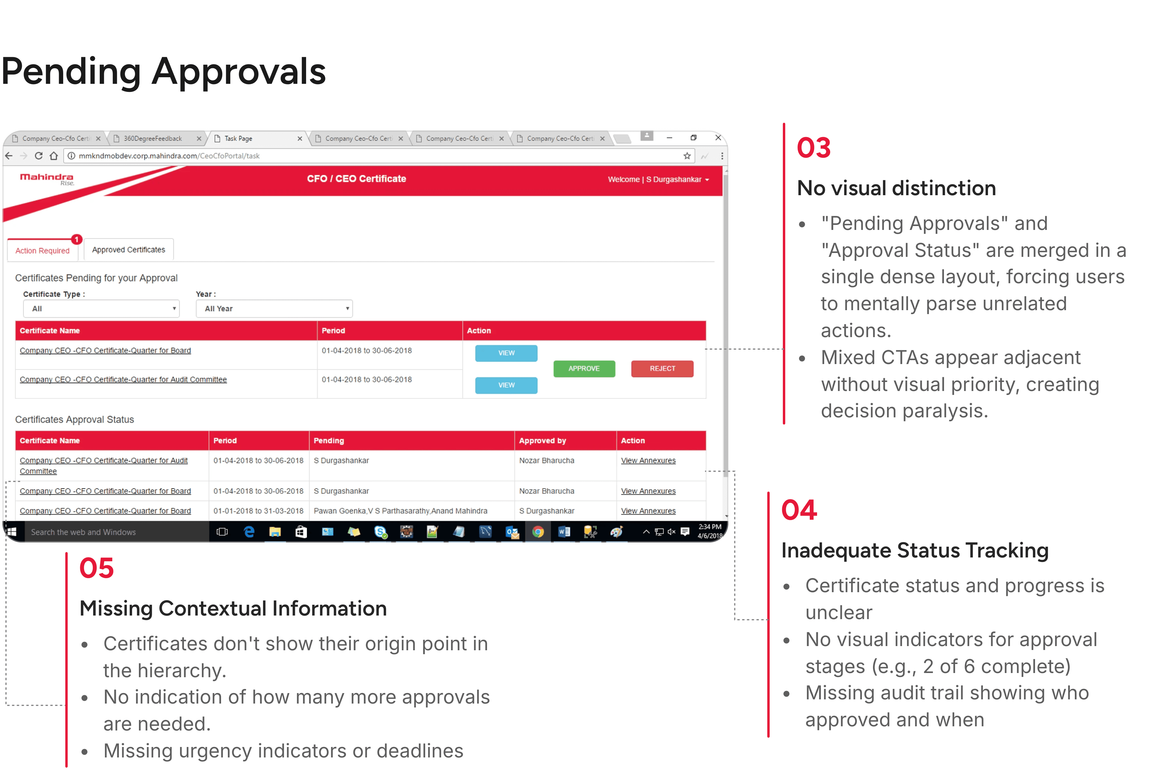To design effectively, we first needed to understand user roles, access levels, and how approvals moved through the hierarchy. Through early discussions with the Mahindra team, we gained clarity on who could initiate, review, or approve certificates. These insights helped us identify bottlenecks and design for smoother workflows.