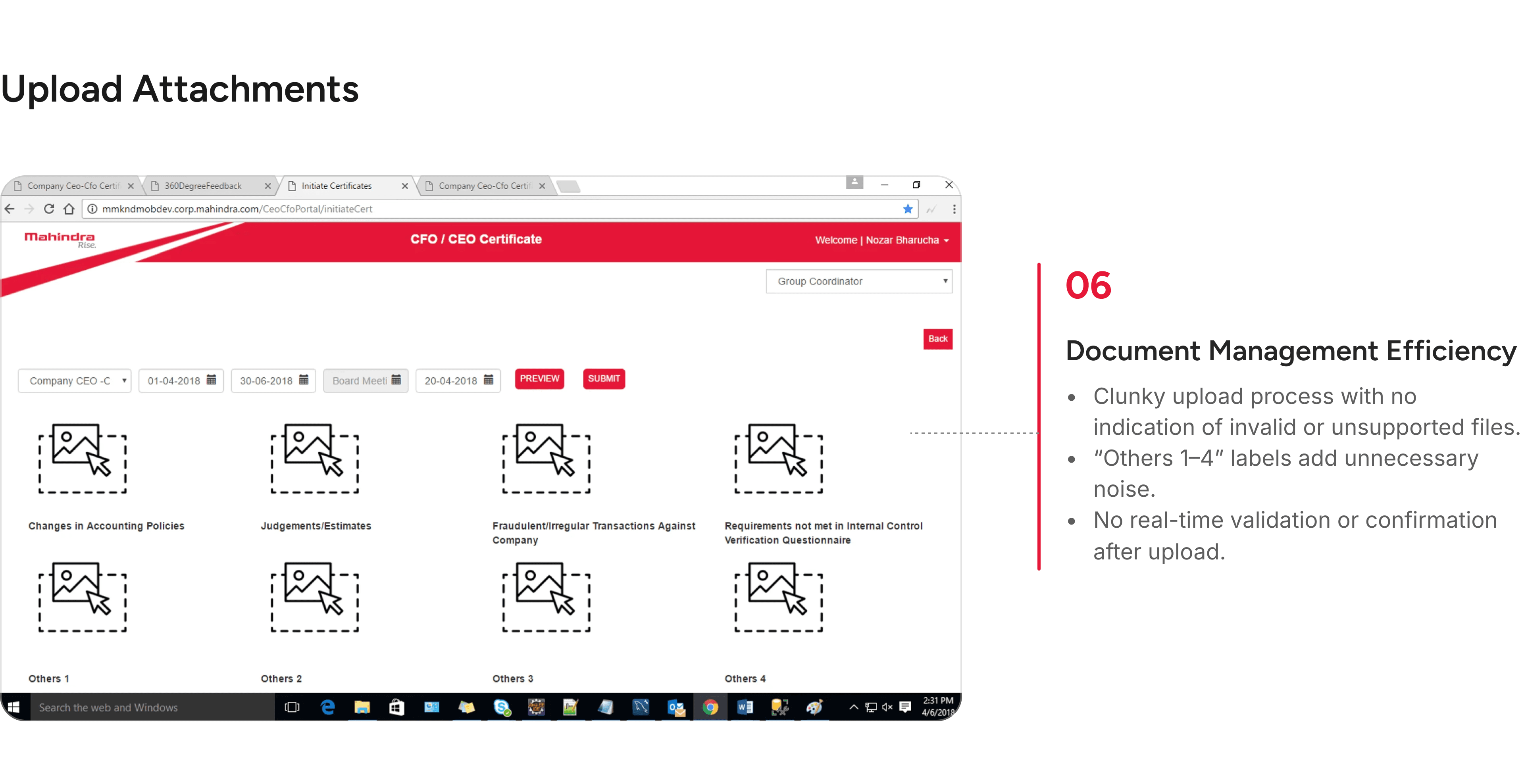The CEO-CFO Portal’s cluttered interface and confusing workflows made it difficult for users across various roles to initiate and approve certificates efficiently, slowing down critical processes and increasing errors at the Division, Sector, and Company levels.