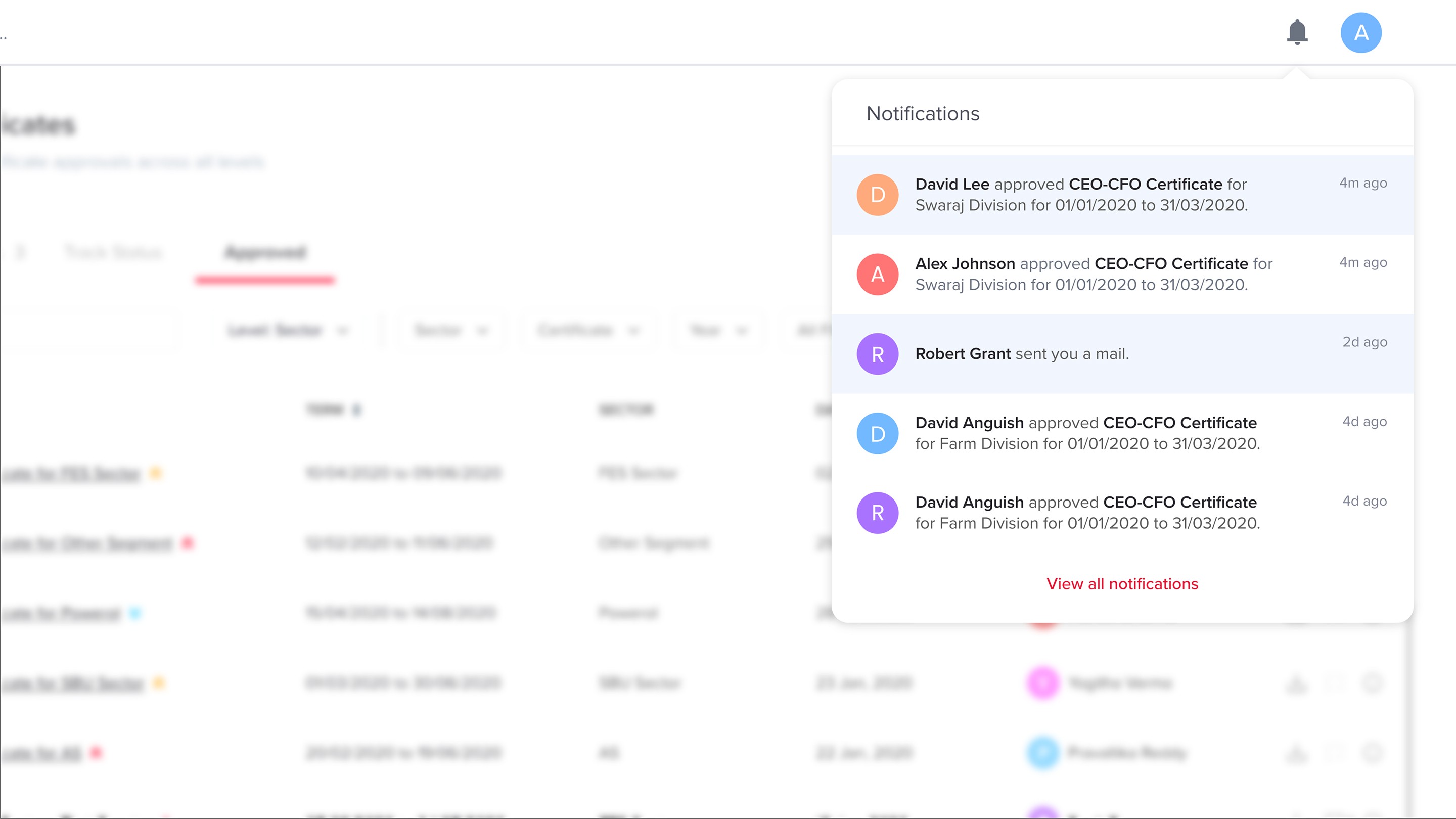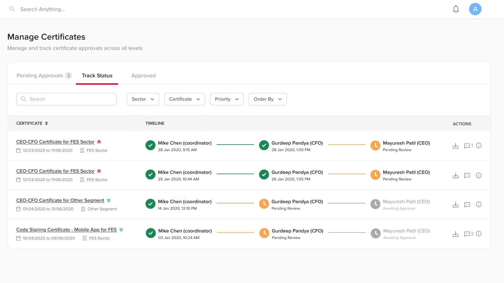 The new layout organizes approvals, tracking, and completed certificates into clear, dedicated tabs making navigation effortless and reducing cognitive load.